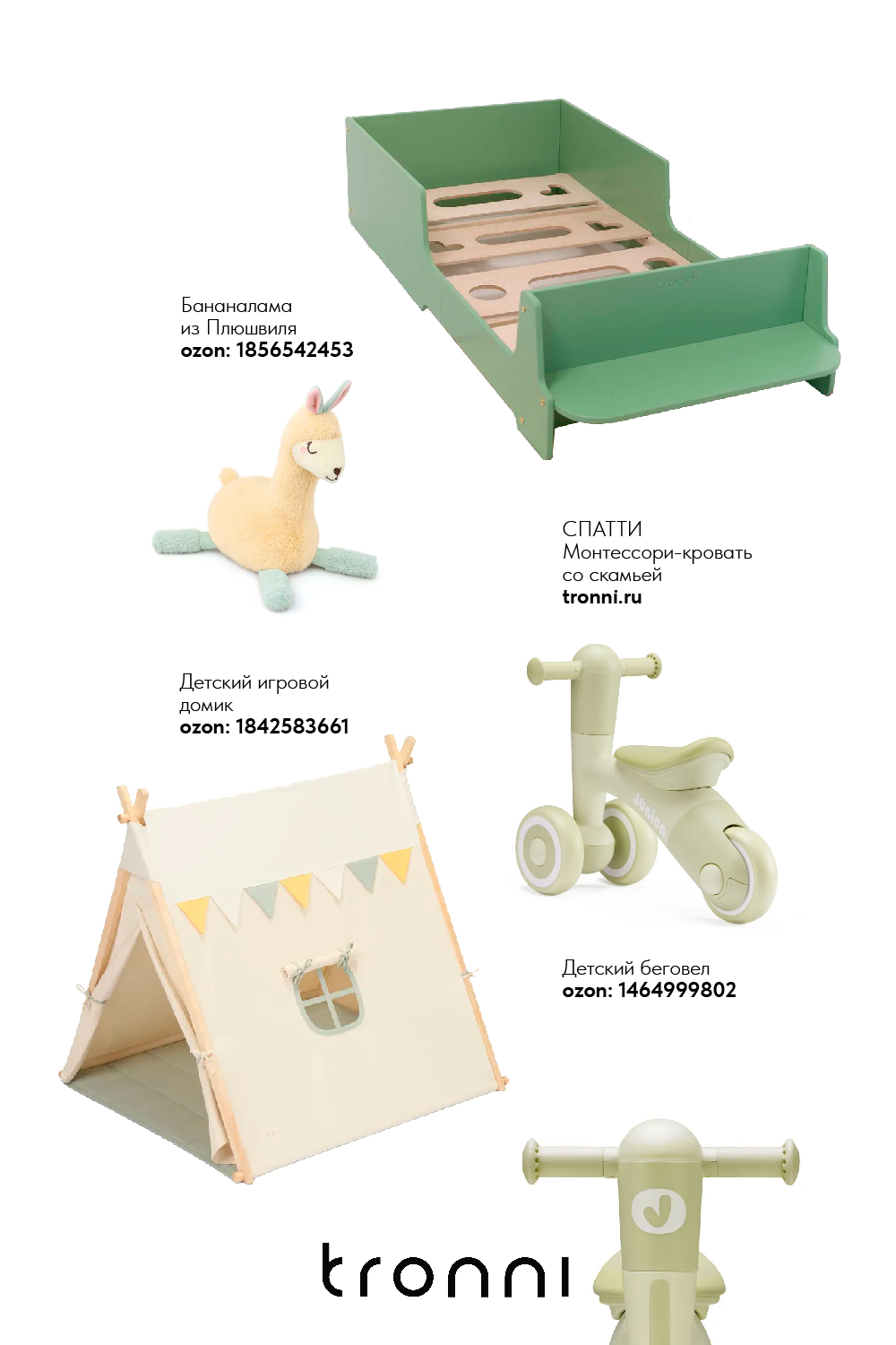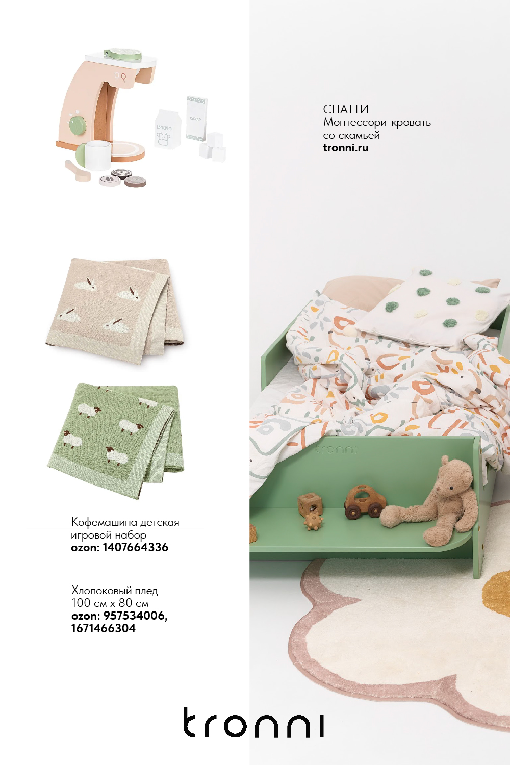 Я — многодетная мама, и за 10 лет декретной жизни поняла, что правильный выбор мебели, её цветовая гамма и функциональность делают жизнь проще и приятнее. Сегодня поделюсь подборкой товаров, которые отлично сочетаются с кроваткой СПАТТИ от TRONNI и идеально вписываются в интерьер